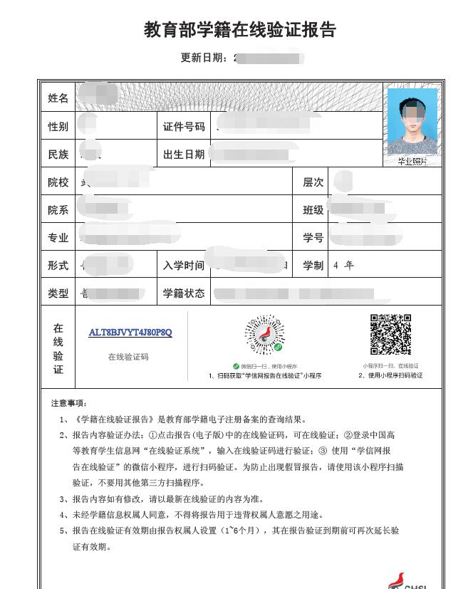 (2)《教育部学籍在线验证报告》(应届生提供,样张见附件1);